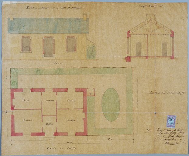 Plan, élévation et coupe du pavillon d'octroi route de Josselin par E. de Lamarzelle, 1880. AM Vannes 1M197.Immatriculation