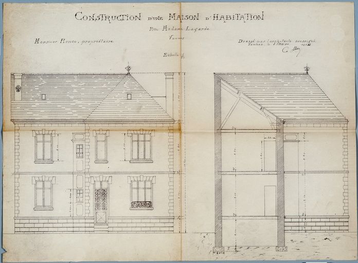 Elévation et coupe transversale, 3 février 1914. AM Vannes 5I162.Immatriculation