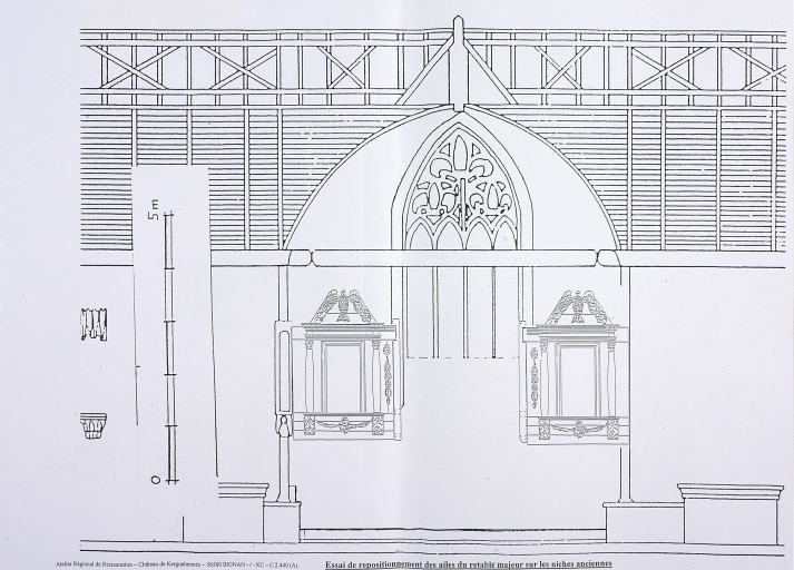 Essai de repositionnement des ailes du retable majeur sur les niches anciennes (d'après un dessin de D. Lefèvre, A.C.M.H.). Atelier Régional de Restauration - Château de Kerguehennec.Immatriculation