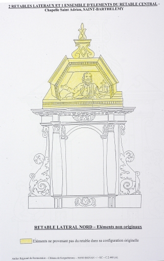 Retable latéral nord. Eléments non originaux (d'après un dessin de D. Lefèvre, A.C.M.H.). Atelier Régional de Restauration - Château de Kerguehennec.Immatriculation