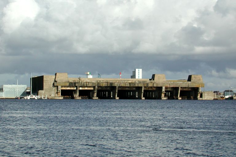 Vue générale depuis Larmor-Plage : entrée des sept alvéoles (2002). Le bunker "KIII" est protégé par des casemates pour canon et mitrailleuse et surmonté d'encuvements pour canon antiaérienImmatriculation