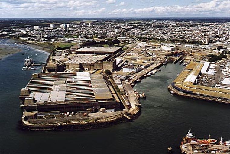Vue aérienne oblique de la base de sous-marins de Lorient-Keroman : bunkers "KIII", "KI" et "KII" (Concours de la base de sous-marins, 1999)Immatriculation