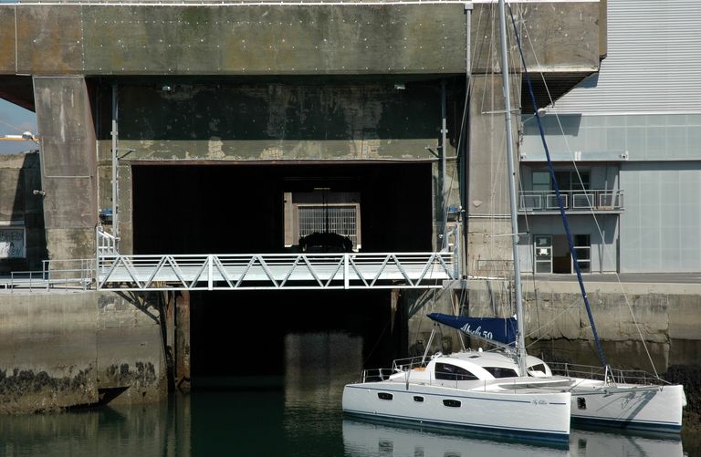 Vue de l'entrée du slipway (2005). Au premier plan à droite, grand catamaran de croisièreImmatriculation