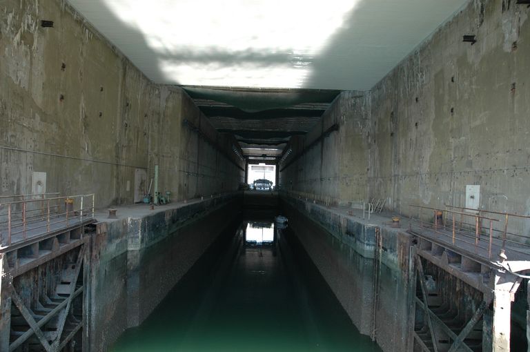 Vue générale de l'intérieur de l'avéole du slipway (2005). Deux portes étanches permettent de retenir l'eau dans le bassin avant le pompageImmatriculation