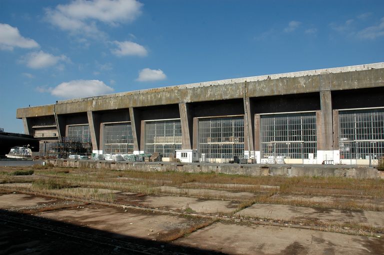 Vue du front avant : contreforts et dalle de couverture (2005). L'édifice compte huit alvéoles dont celle servant d'abri au chariot de translation des sous-marins (abri surmonté par la caserne dites des 1000)Immatriculation