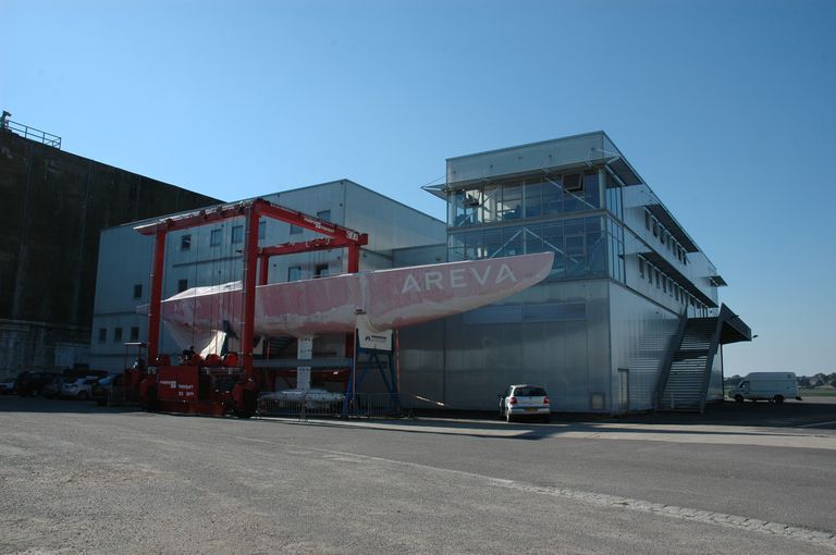 Exemple de reconversion industrialo-portuaire : hangar - dock du bateau Areva de la Coupe de l'America flanquant le bunker "KIII" (2005). Le site des Défis, occupé par le "Groupama Team France", a été ravagé par un incendie le 9 juin 2018Immatriculation