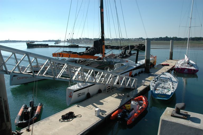 Exemple de reconversion industrialo-portuaire : maxi-catamaran Orange au ponton devant le bunker "KIII" (2005). Le skippeur Bruno Peyron a remporté le record du tour du monde à la voile lors du trophée Jules-Verne (2002) avec ce bateauImmatriculation