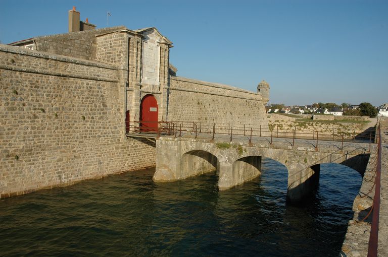 Vue de la citadelle de Port-Louis : porte monumentale, pont-levis et pont-dormant de la demi-luneImmatriculation