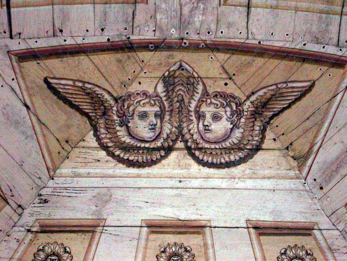 Chapelle, plafond lambrissé et peint, détaill des angelots.Immatriculation