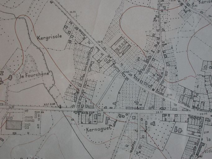 Plan de la ville par Gay, Ministère de la Reconstruction, 1952 : détail parties avenue de la Marne et route de Sainte-Anne. AM Vannes 9Fi.Immatriculation