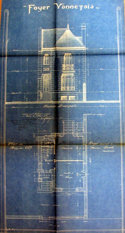 Elévation de la façade antérieure et plan du rez-de-chaussée de la maison Genet, 7 mars 1913 par Gemain. AM Vannes 5I162.Immatriculation