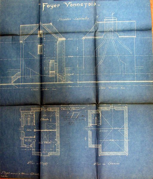Elévation des façades latérales et plan de l'étage de la maison Genet, 7 mars 1913 par Gemain. AM Vannes 5I162.Immatriculation