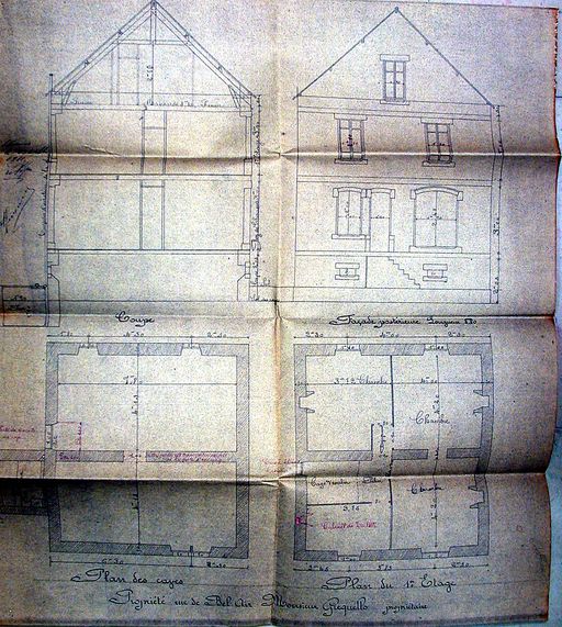 Elévation de la façade postérieure et plan de la maison Gicquello par Lefèvre, 23 septembre 1911. AM Vannes 5 I 162.Immatriculation