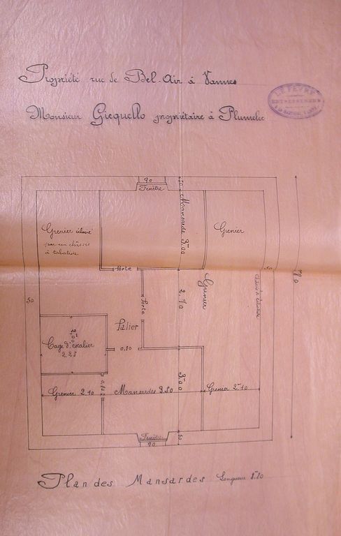 Plan des mansardes de la maison Gicquello. AM Vannes 5 I 162.Immatriculation