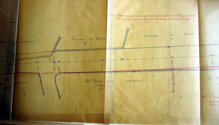 Projet de classement et de fixation des alignements de la rue Philippe Lebon, entre la rue Madame Molé et la rue Ampère. Plan dressé par Thiévard, partie médiane près de la fonderie de Kerino, 20 février 1925. AD Morbihan 3O 2183.Immatriculation