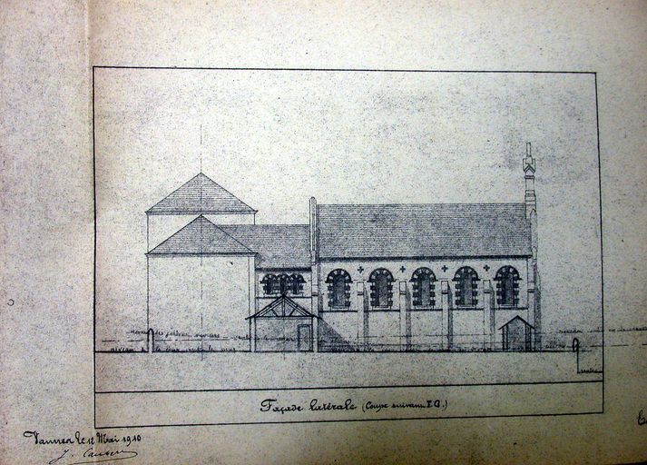 Elévation latérale nord de la chapelle Sainte-Anne de l'école d'hydrographie par J. Caubert de Cléry, 12 mai 1910. AM Vannes 5 I 162.Immatriculation