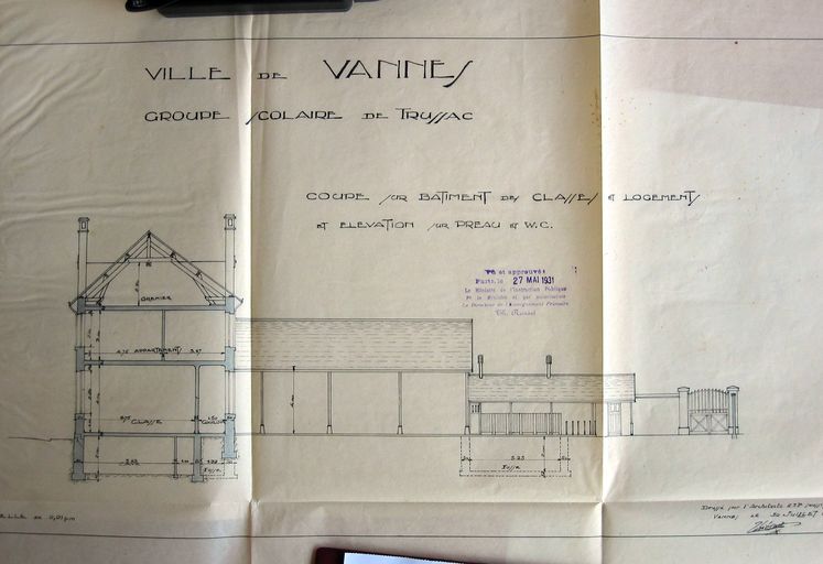 Coupe sur bâtiment des classes et logement et élévaqtion sur préau, dressée par Thiévard, 30 juillet 1930. AD Morbihan 2O 260/12.Immatriculation