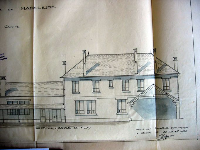 Elévation sur cour, dressée par Thiévard, 30 juillet 1930 : détail : pavillon de l'école des filles. AD Morbihan 2O 260/12.Immatriculation