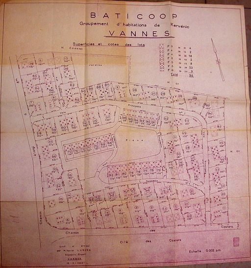 Plan du lotissement Baticoop dressé par X. Lunven, 10 Mars 1955. AM Vannes 1O221.Immatriculation