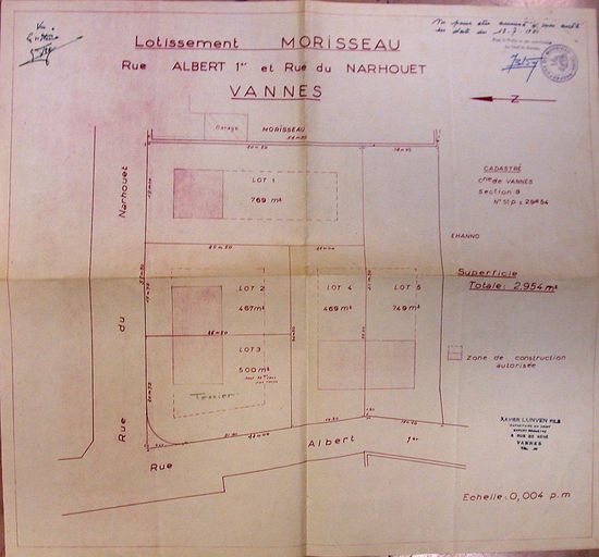 Vue générale : plan du lotissement Morisseau dressé par X. Lunven, 1951. AM Vannes 1O221.Immatriculation