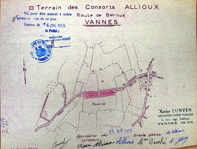 Plan de situation du lotissement des consorts Allioux par Lunven, 1959. AM Vannes 1O221.Immatriculation