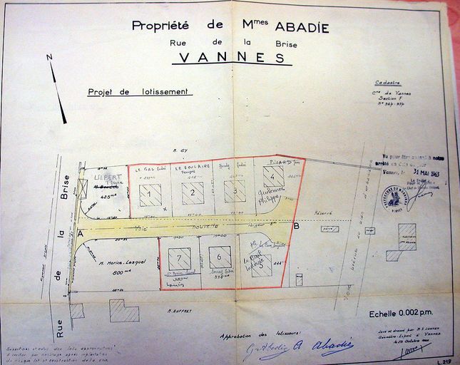 Vue générale : plan du lotissement Abadie dressé par X. Lunven, 1962. AM Vannes 1O221.Immatriculation