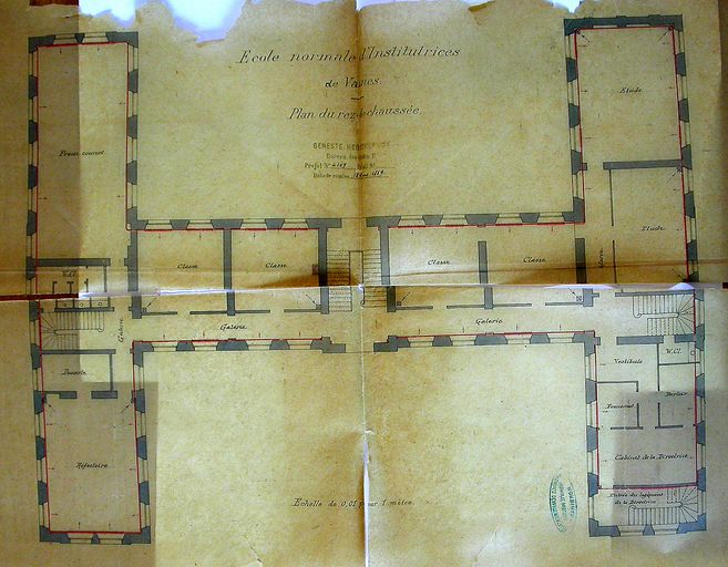 Plan du rez-de-chaussée de l'école normale par Maigné, vers 1883. AD Morbihan N 757.Immatriculation