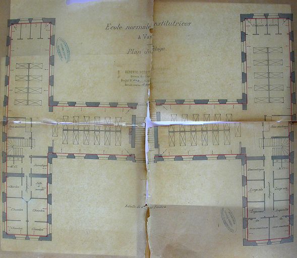 Plan du 1er étage de l'école normale par Maigné, vers 1883. AD Morbihan N 757.Immatriculation