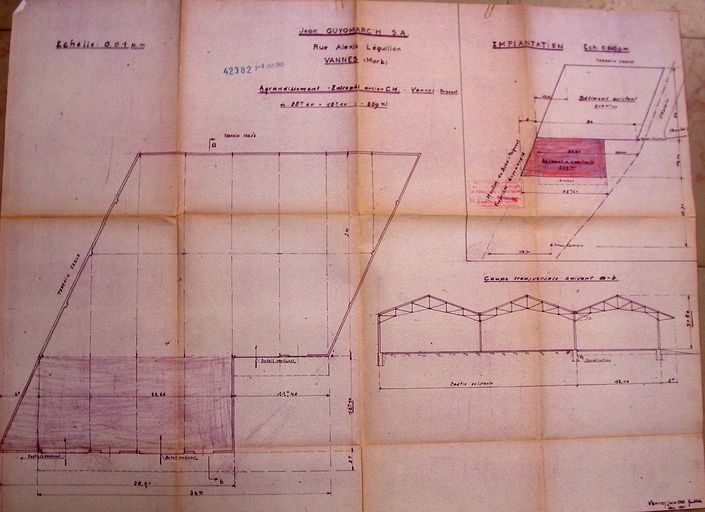 Plan au sol et élévation de l'extension de l'ancien entrepôt du CM approuvée le 10 octobre 1962. AM Vannes 5I162.Immatriculation