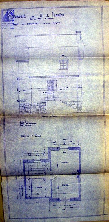 Elévation latérale est et plan de l'étage de la maison construite pour Mr La Flaouter par A. Charron. AM Vannes 5I162.Immatriculation