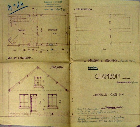 Plan de la maison Chambon par Santin entrepreneur, non attribué dans la rue de Metz. AM Vannes 5I162.Immatriculation