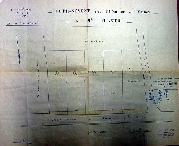 Plan du lotissement Turnier, 1938. AM Vannes 1O221.Immatriculation