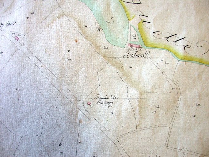 Plan cadastral 1809, section. Moulin à eau et à vent de Rohan. AD Morbihan 3P.Immatriculation