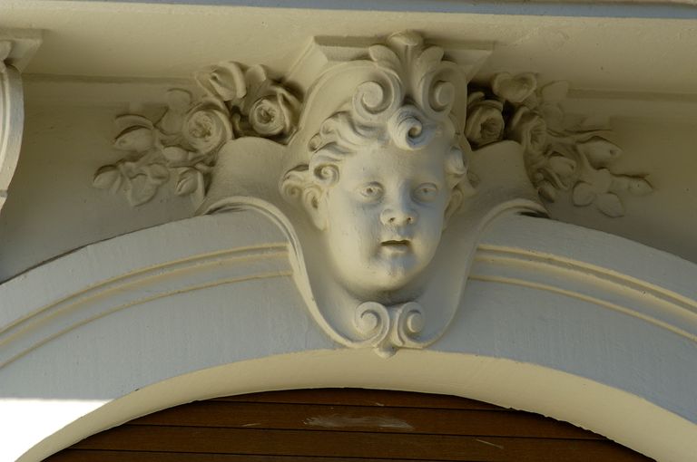 Clef passante sculptée d'une tête d'enfant au-dessus d'une fenêtre.Immatriculation