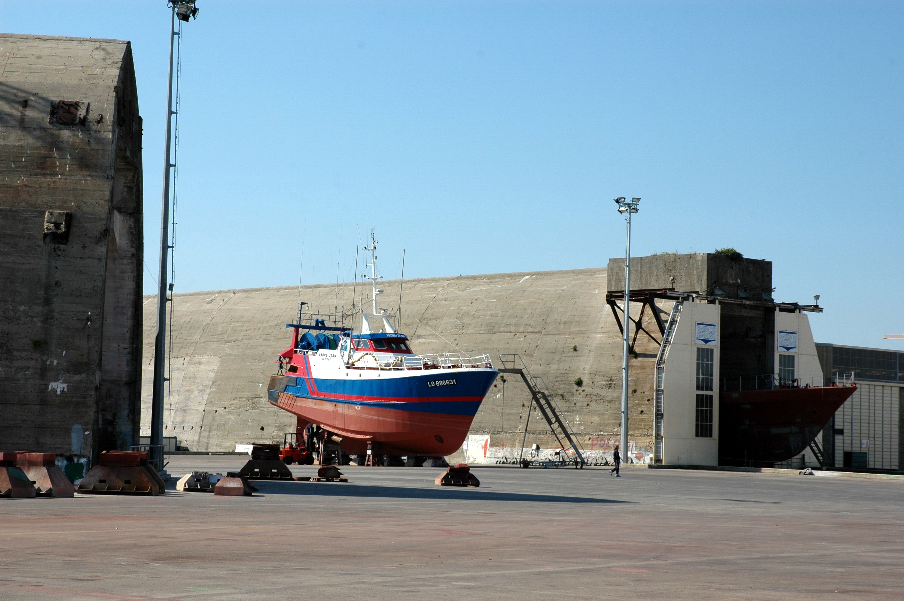 Vue de situation depuis l'est (2005). Au centre sur le terre-plein, le chalutier "André Jean" de LorientImmatriculation