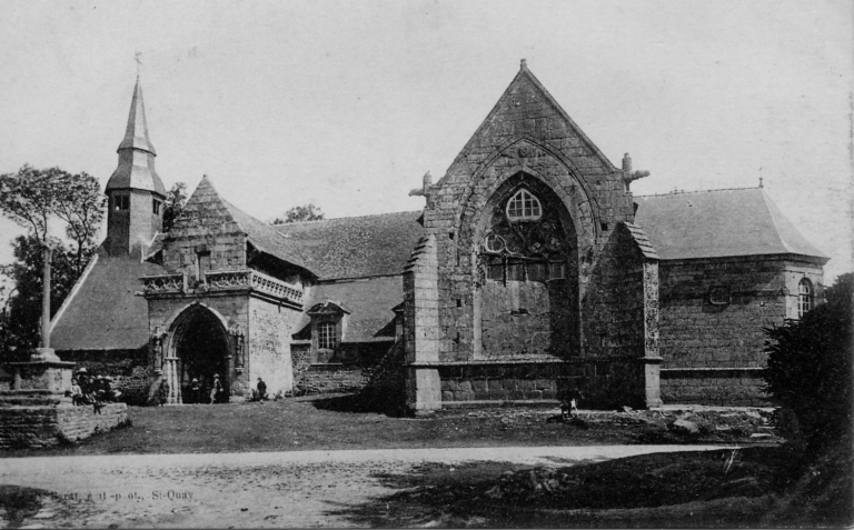 La chapelle de Kermaria-An-Isquit avant sa réfection : le lavoir et la fontaine sont situés en face de l'aile gauche de l'édifice, 1er quart 20ème siècle (collection particulière)Immatriculation