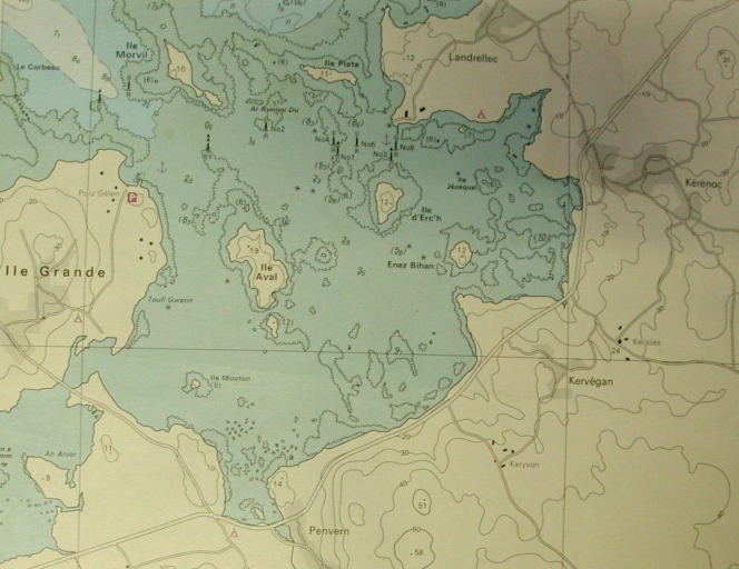 Extrait de la carte du SHOM : le balisage actuel de l'Île Grande à Landrellec, la baie de Keralies (DDE 22, Phares et Balises, Ponts et Chaussées)Immatriculation