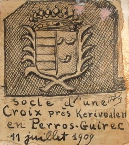 Ecu figurant sur le socle d'une croix près de Kerivoalan en Perros-Guirec, d'après croquis du vicomte Henri Frotier de La Messelière, 11 juillet 1909 (AD 22)Immatriculation