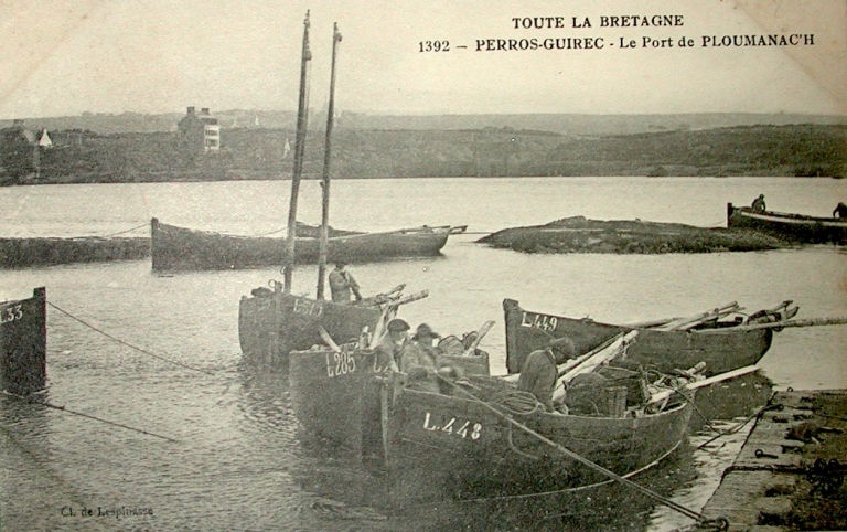 Les chaloupes en retour de pêche débarquent à la cale de Pen ar Chrec'h, non loin de la cale Padel, encore privée, et du rocher Karreg Roc'h Ist, aujourd'hui disparu, 1904 (collection particulière)Immatriculation