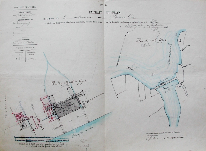 Plan du moulin à marée en 1889 pour aménagement d'un bâtiment annexe pour le meunier Pierre Geffroy (AD 22)Immatriculation