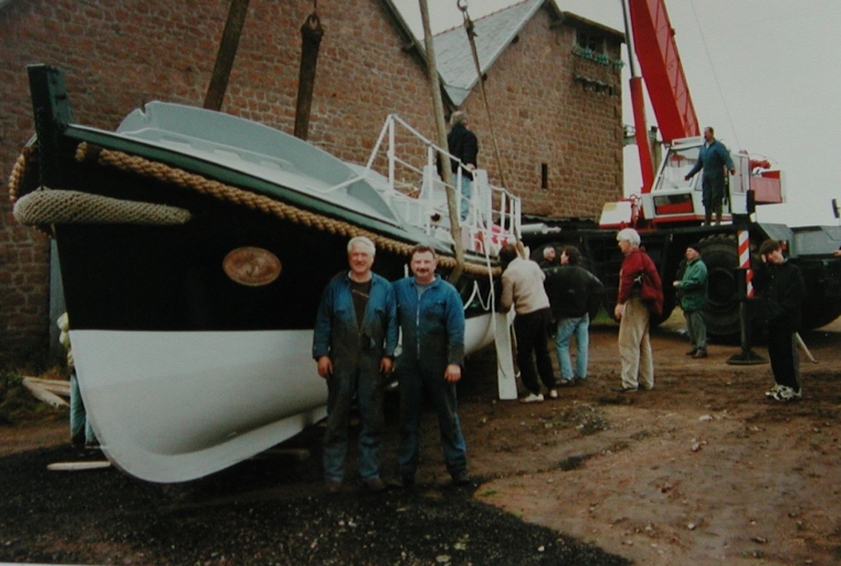 Aimée-Hilda sort du chantier de la Clarté après 1 an de travaux, on reconnaît Loulou Morvan, cheville ouvrière du projet (collection particulière)Immatriculation