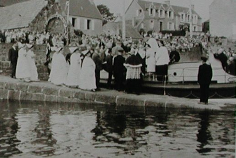 L'Aimée Hilda à la cale de Ty Ruz avec les officiels civils et religieux en 1950 (collection particulière)Immatriculation