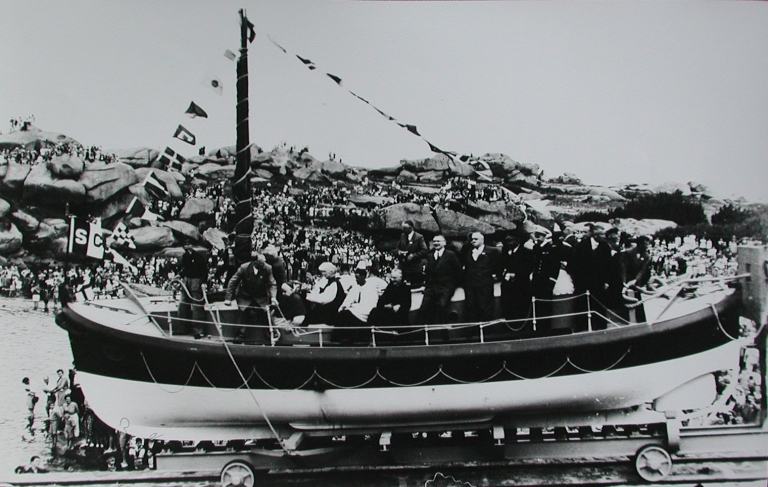Le baptême du canot Aimée-Hilda en juillet 1950, en présence du maire Joncour, de l'évêque Courcoux et des marraines (collection particulière)Immatriculation