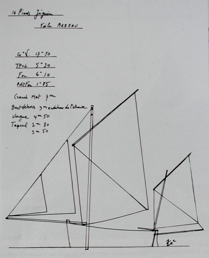 Dessin de Michel Duédal : plan de voilure d'un canot jaguen (collection particulière)Immatriculation