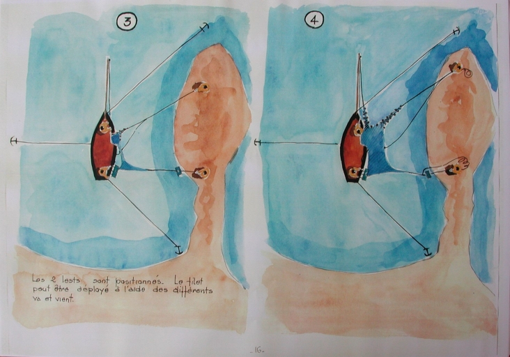 Dessin n°11 : descriptif du positionnement du bateau et du mouillage du filet pour la pêche à la trappe (Loïc Ollivier)Immatriculation