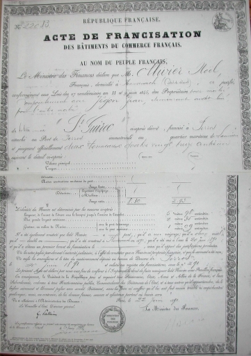 Certificat de construction du Saint-Guirec par Nicolas Briand, 1891 (collection particulière)Immatriculation