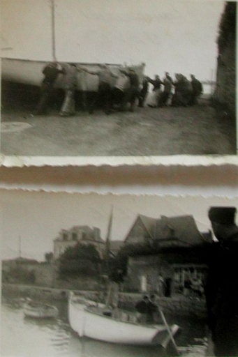 Mise à l'eau sur des billots de bois ; Yves Quéré et Yves Le Guern à la godille, 1944 (collection particulière)Immatriculation