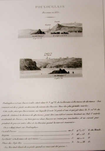 Relevé de côte de Beautemps-Beaupré en 1837 : remarquer le rocher par la passe ouest de la Horaine (pas encore balisée) et la chapelle de La Clarté, comme amer remarquable (AD 22)Immatriculation