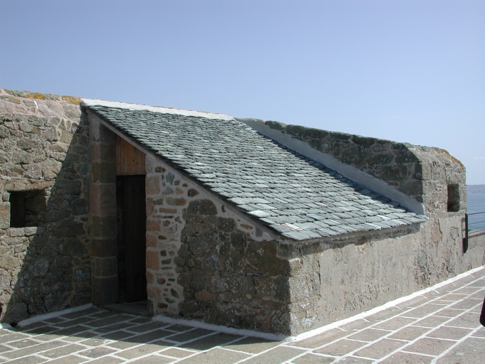 Façade sud-ouest du fort : vue du corps de garde (couverture refaite en lauzes de l'Île Milliau)Immatriculation