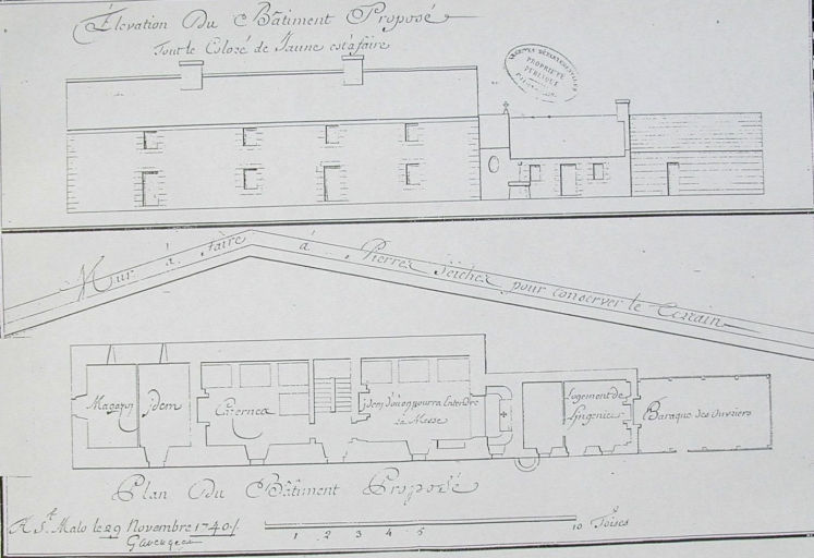 Le plan du bâtiment de la caserne dessiné par Garangeau le 29 novembre 1740 (AD 35)Immatriculation
